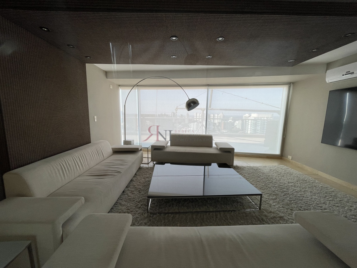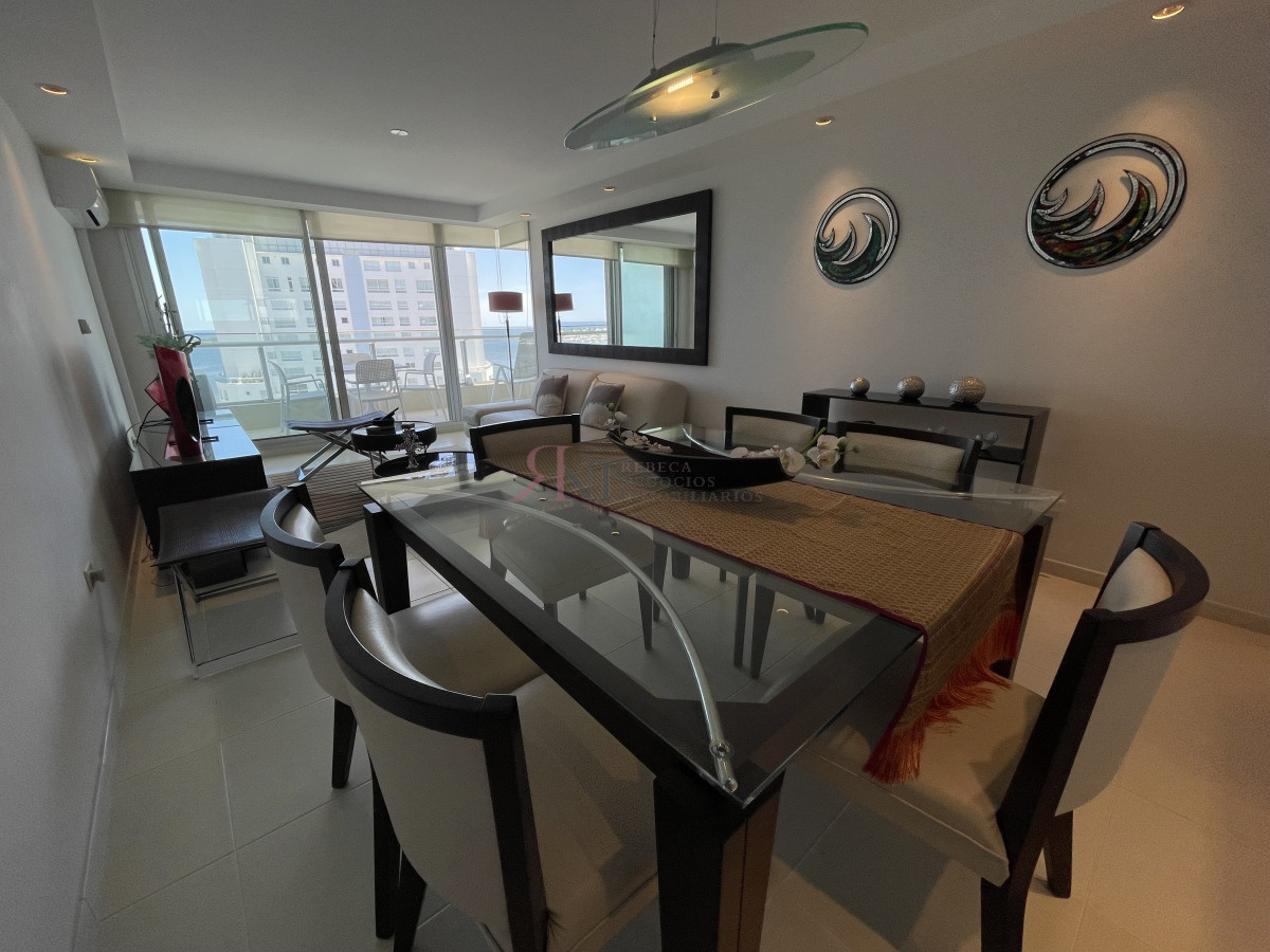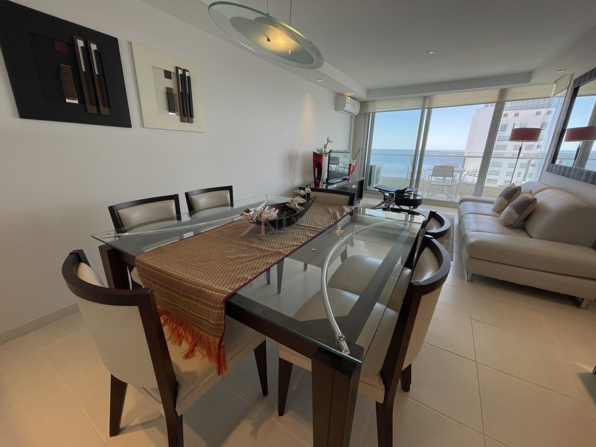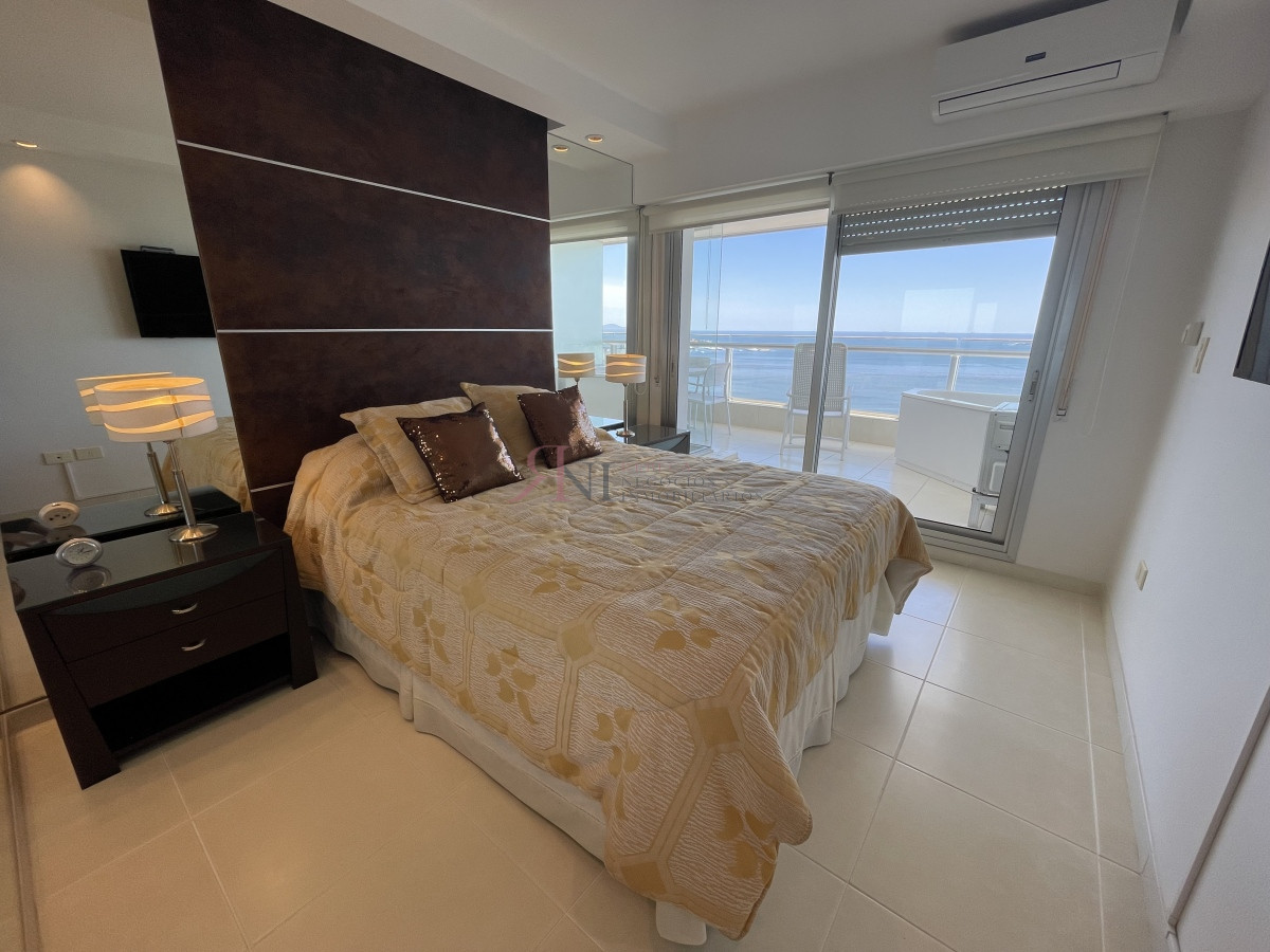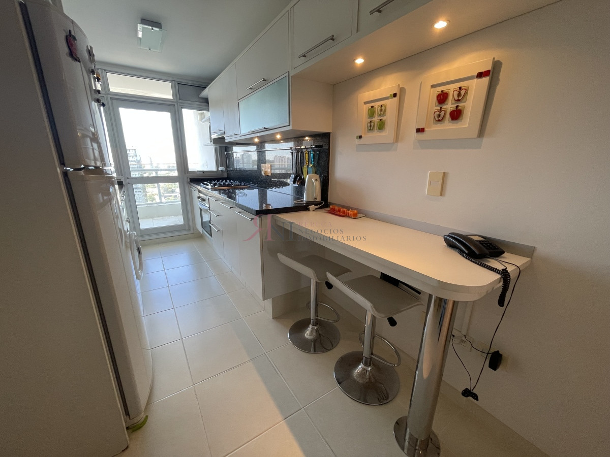El living comedor tiene increible vista panorámica a la isla Gorritti , terraza abierta, 2 dormitorios en suite, toilette, cocina completa y definida, garaje.