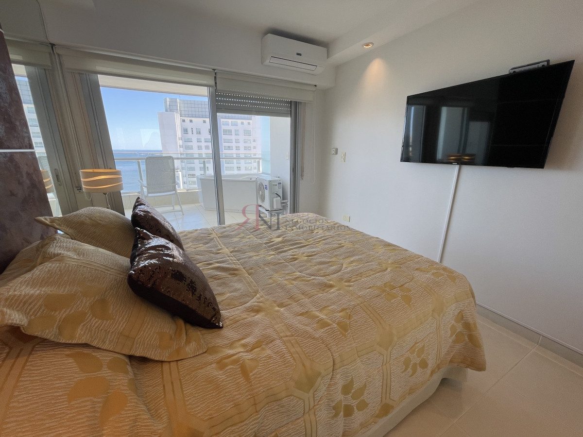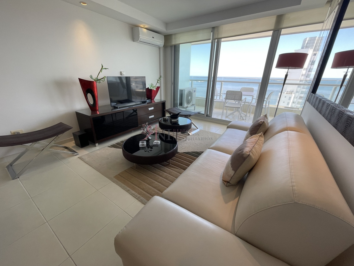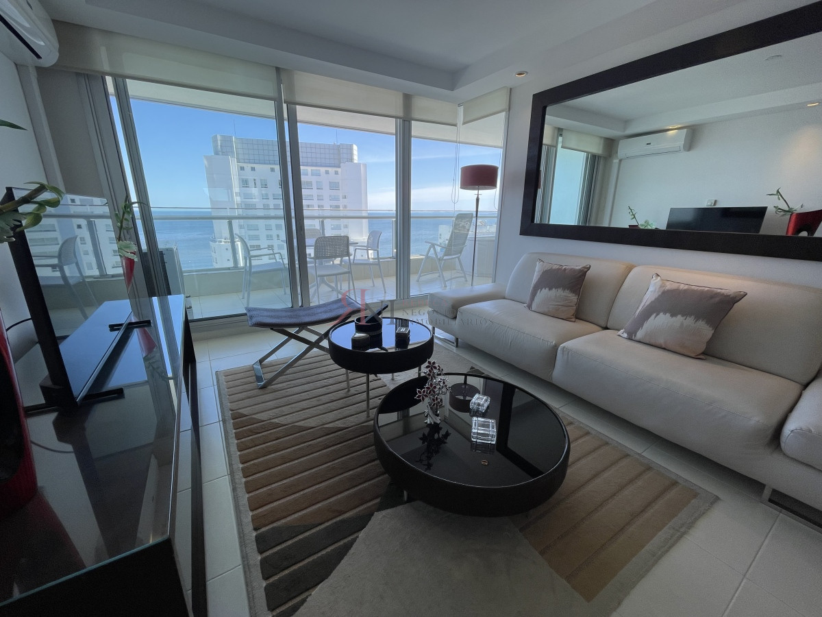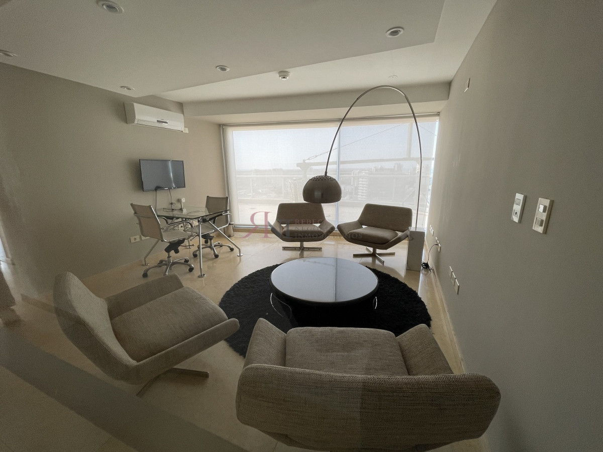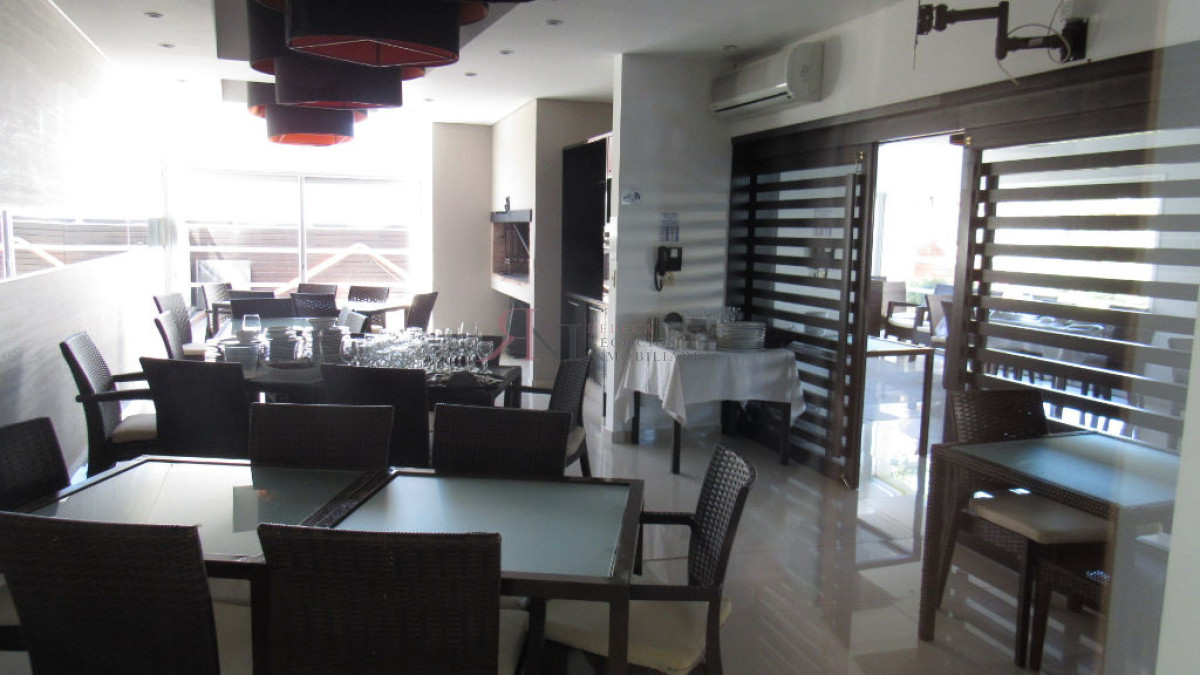 El living comedor tiene increible vista panorámica a la isla Gorritti , terraza abierta, 2 dormitorios en suite, toilette, cocina completa y definida, garaje.