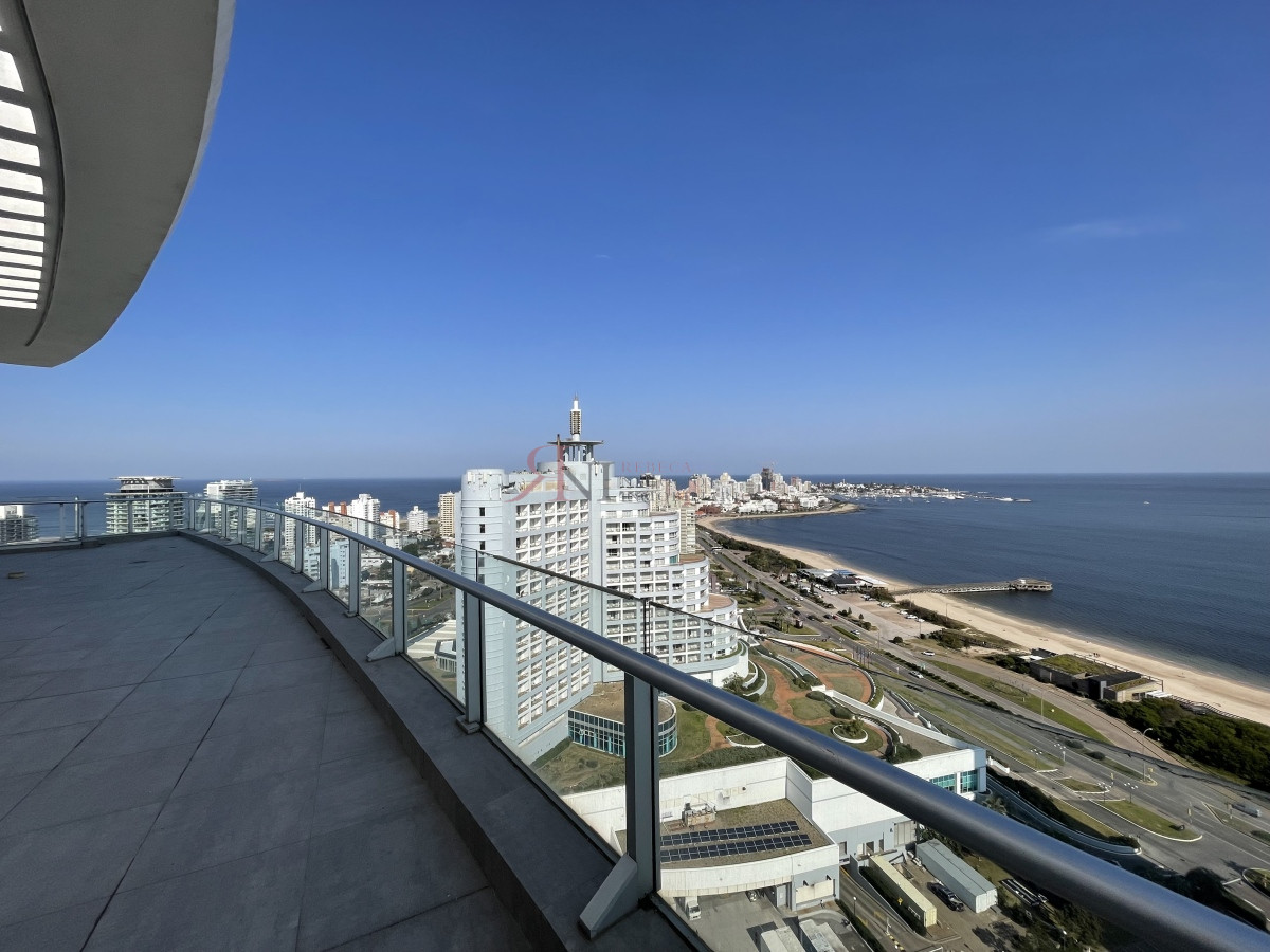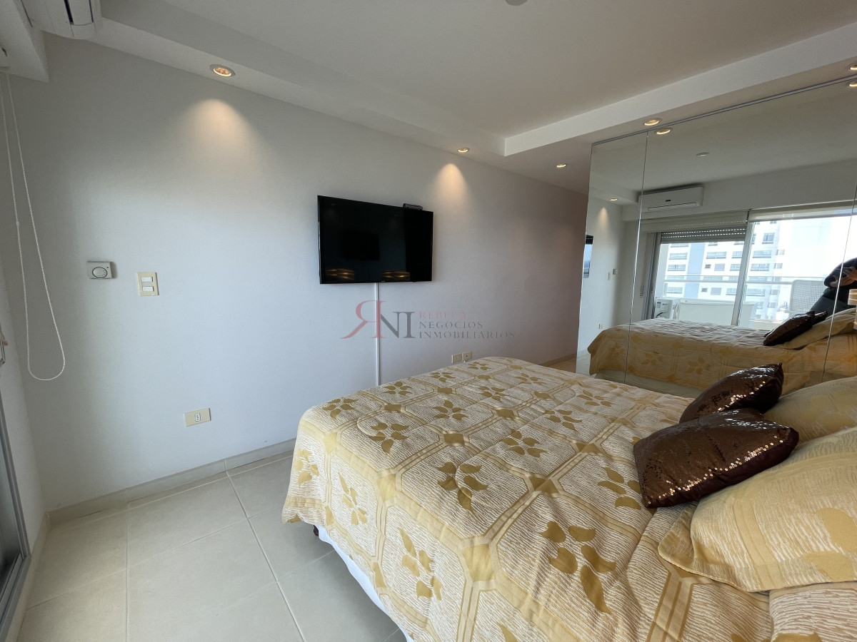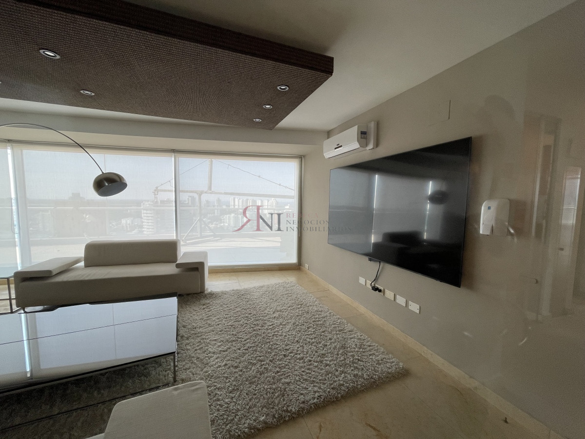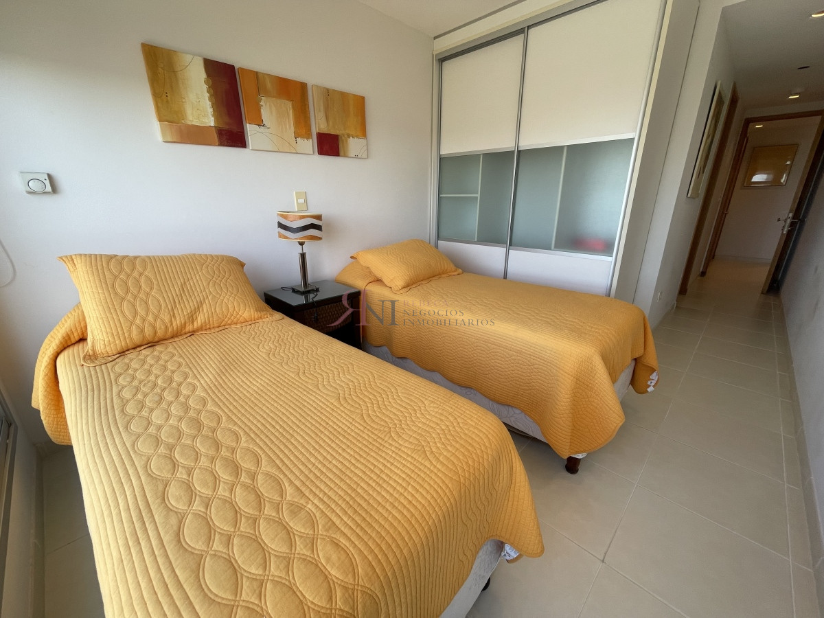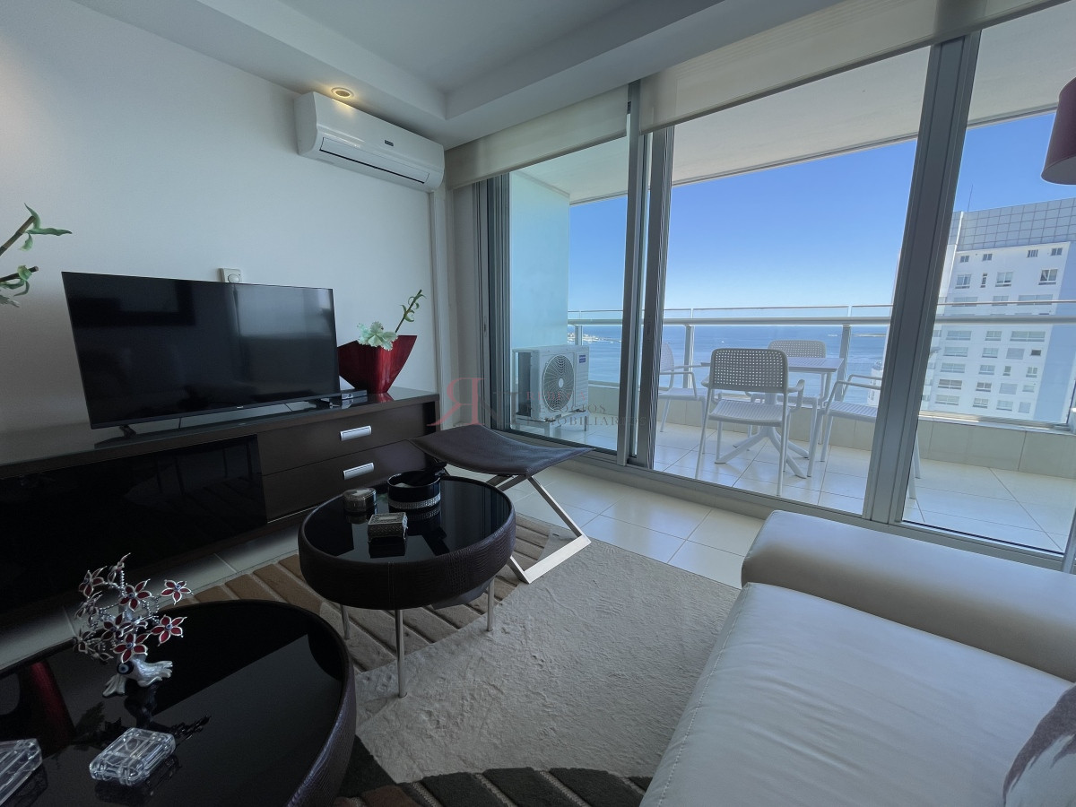 El living comedor tiene increible vista panorámica a la isla Gorritti , terraza abierta, 2 dormitorios en suite, toilette, cocina completa y definida, garaje.